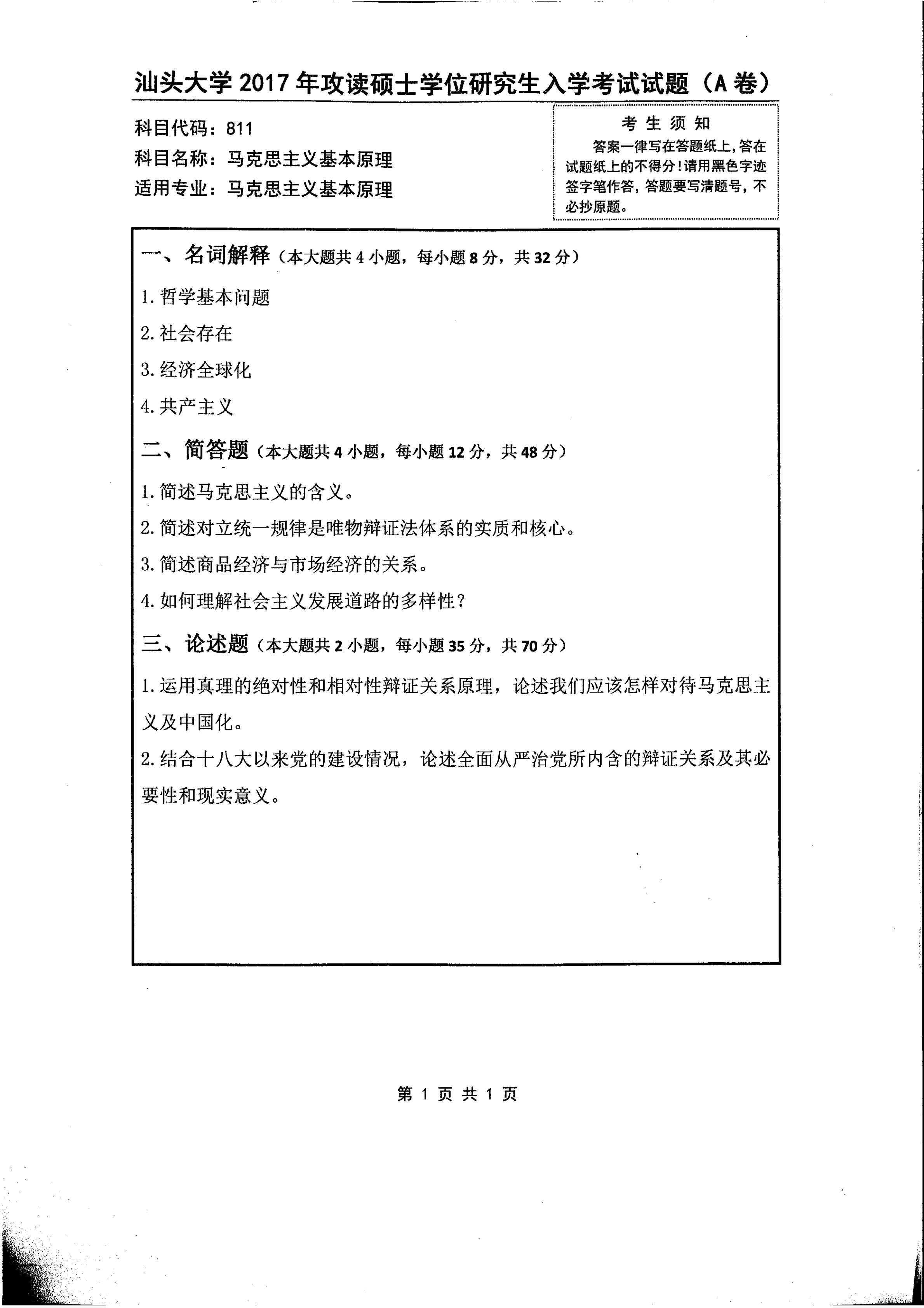 汕头大学考研辅导班:2017年汕头大学考研811马克思主义基本原理真题