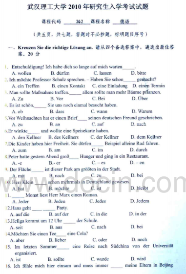 2020-2021年武汉理工考研辅导班:2010年武汉理工大学242德语考研真题