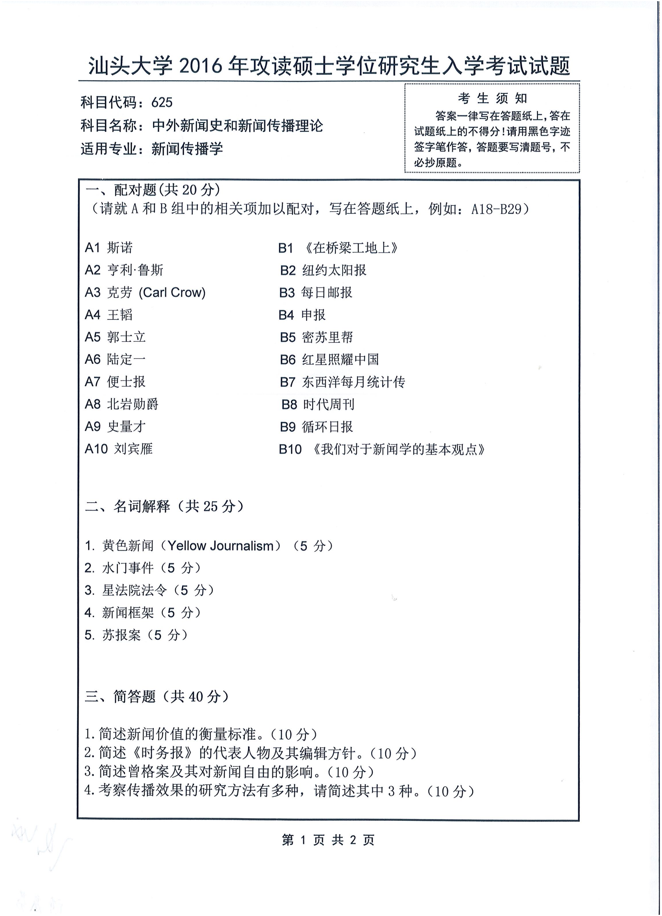 汕头大学考研辅导班:2016年汕头大学625中外新闻史与新闻传播理论考研真题