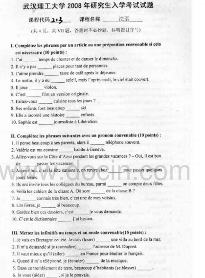 2020-2021年武汉理工考研辅导班:武汉理工大学243法语2008年考研真题