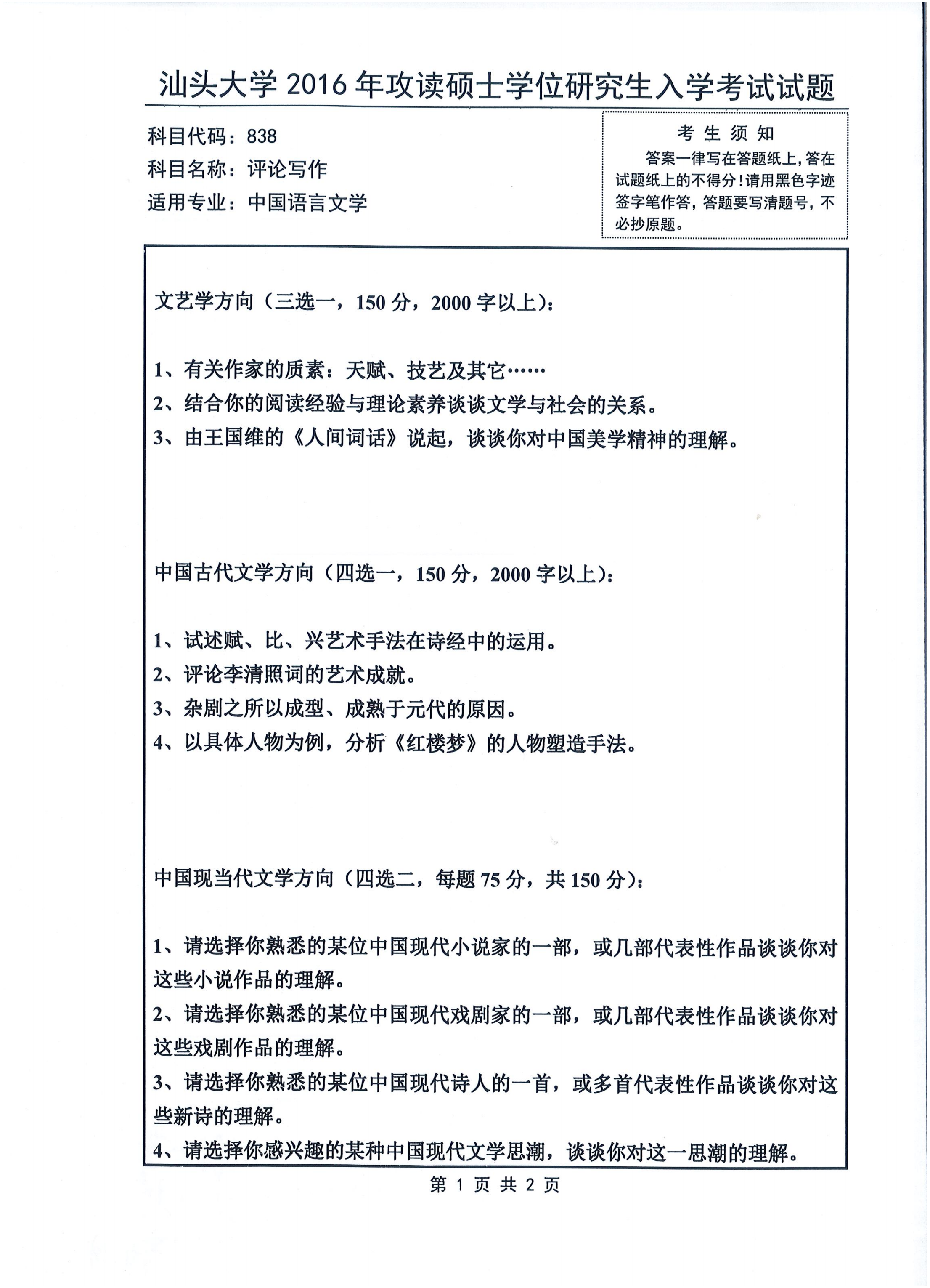 汕头大学考研辅导班:2016年汕头大学838评论写作考研真题