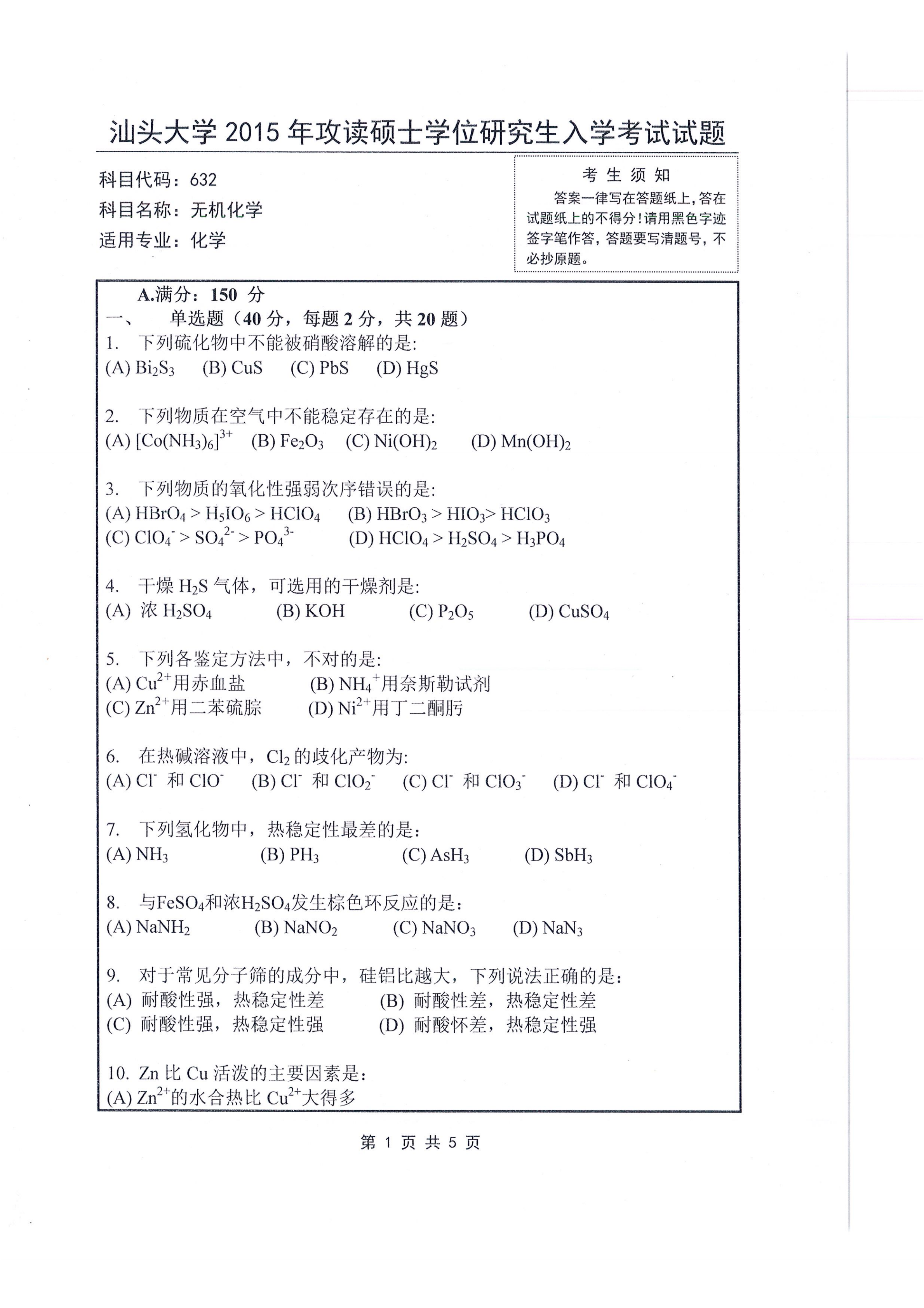 汕头大学考研辅导班:2015年汕头大学632无机化学考研真题
