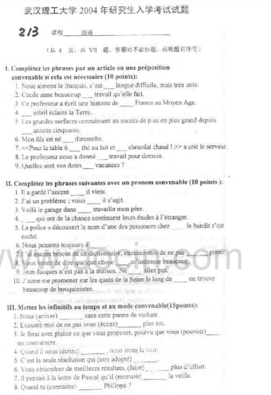 2020-2021年武汉理工考研辅导班:武汉理工大学243法语2004年考研真题