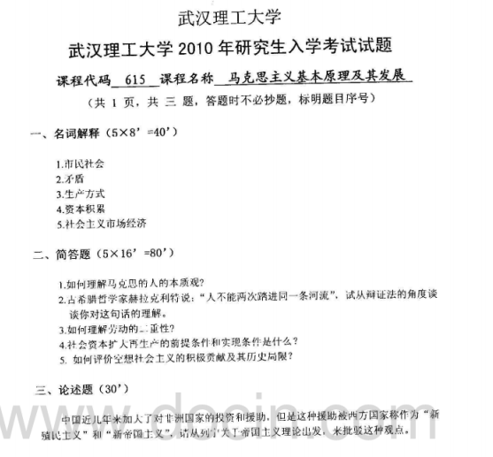 2020-2021年武汉理工考研辅导班:武汉理工大学615马克思主义基本原理及其发展2010年考研真题