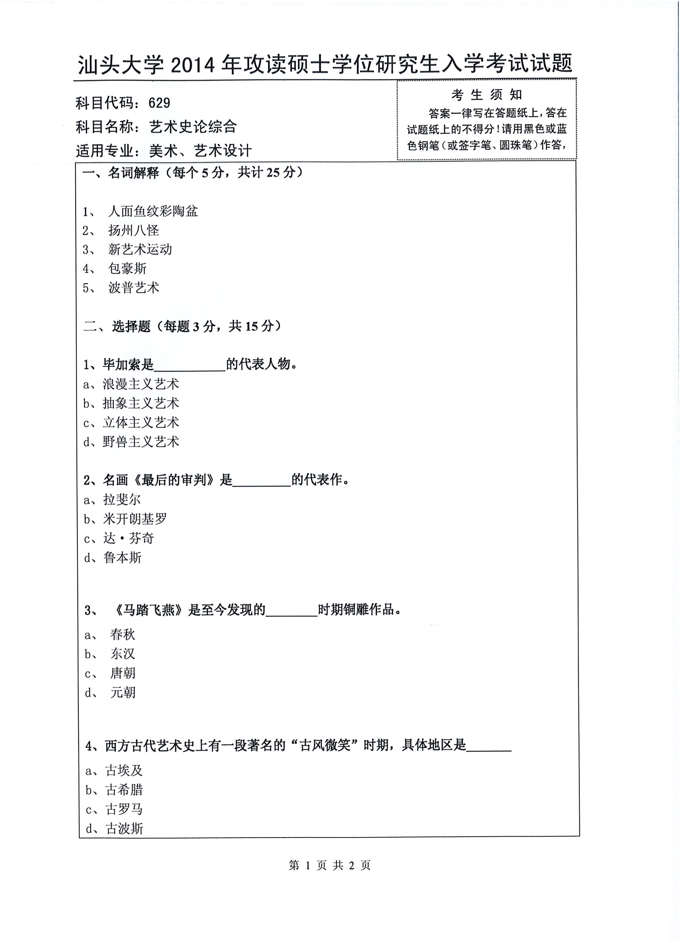 汕头大学考研辅导班:2014年汕头大学考研629艺术史论综合真题