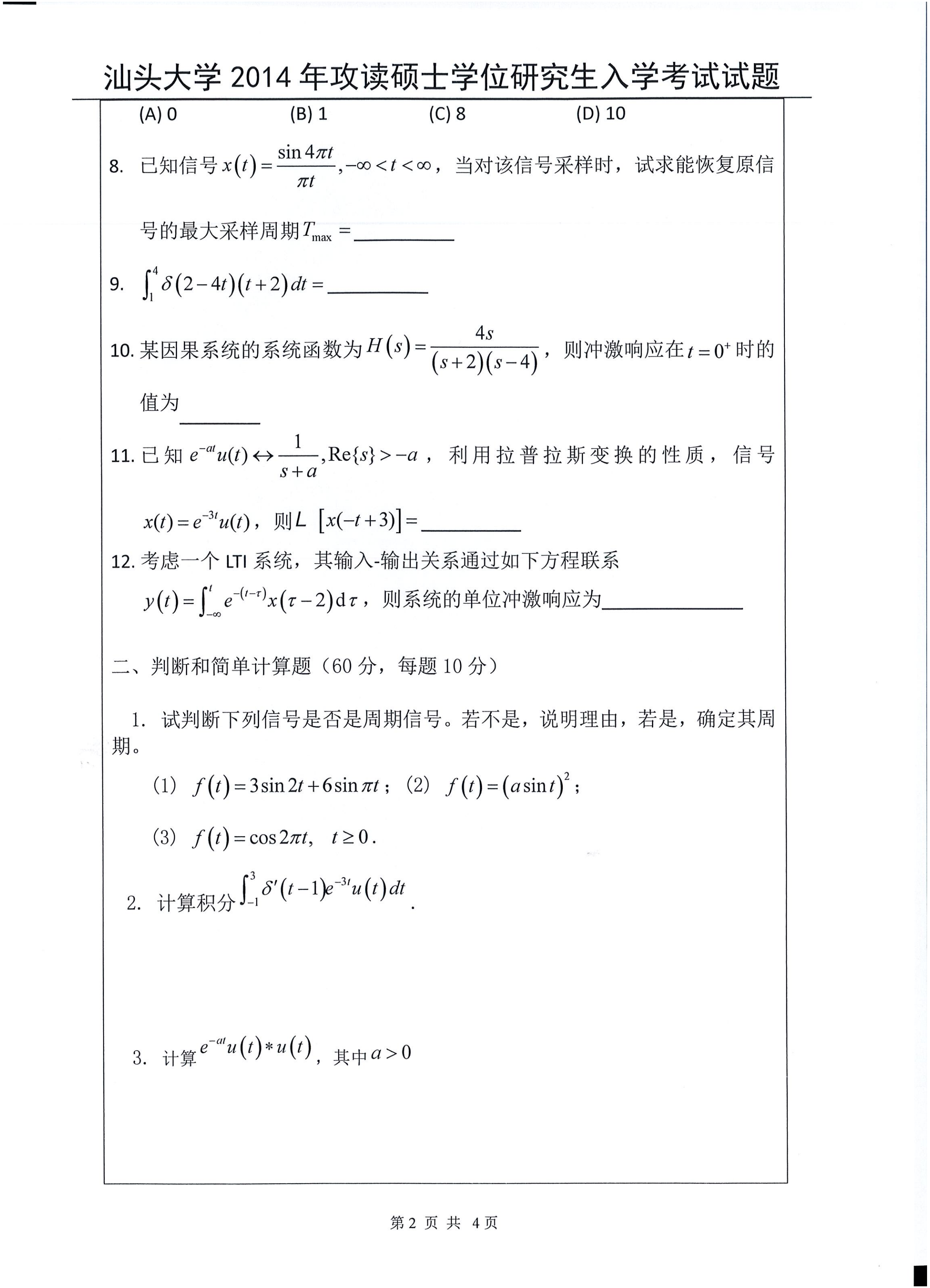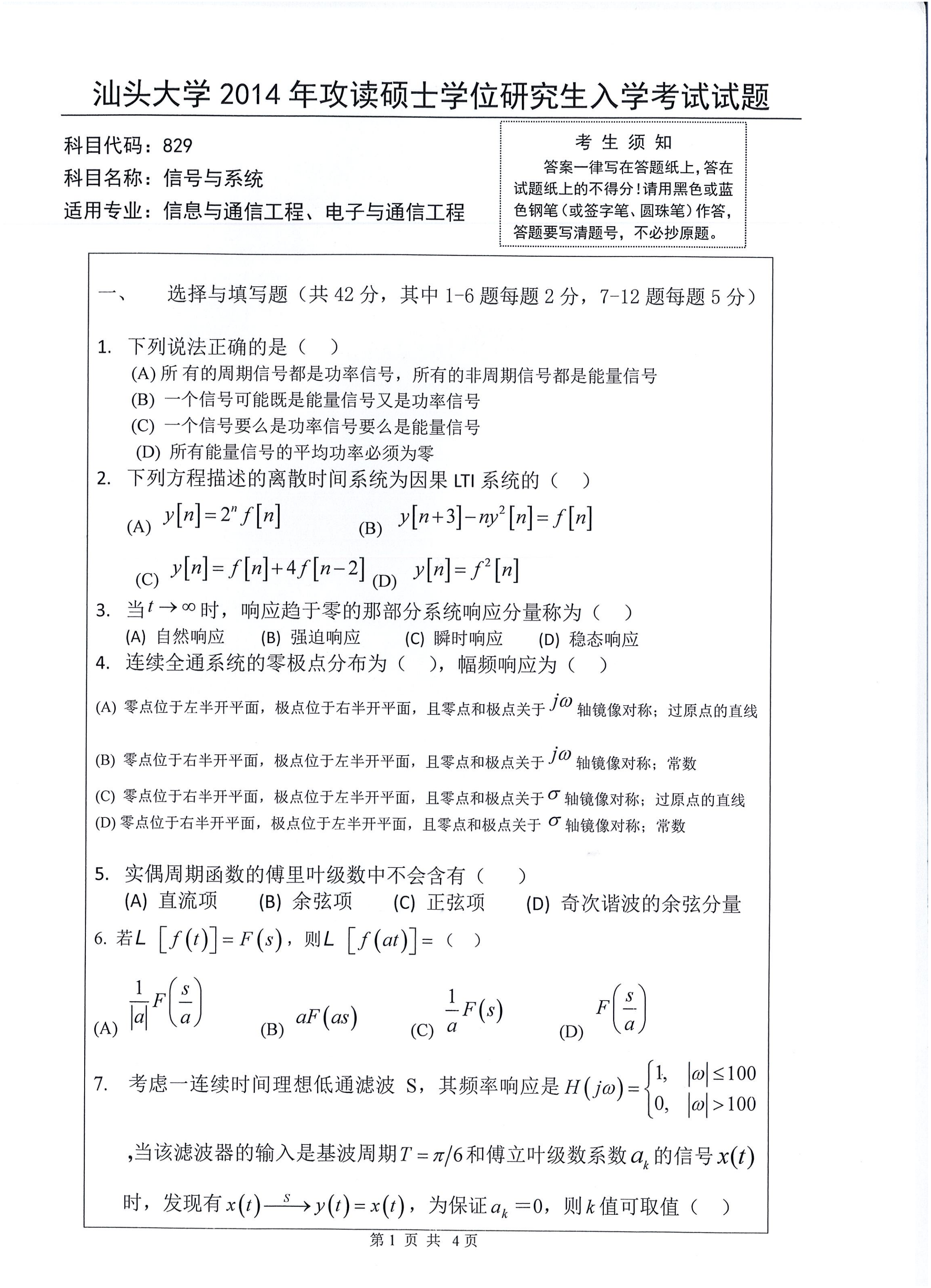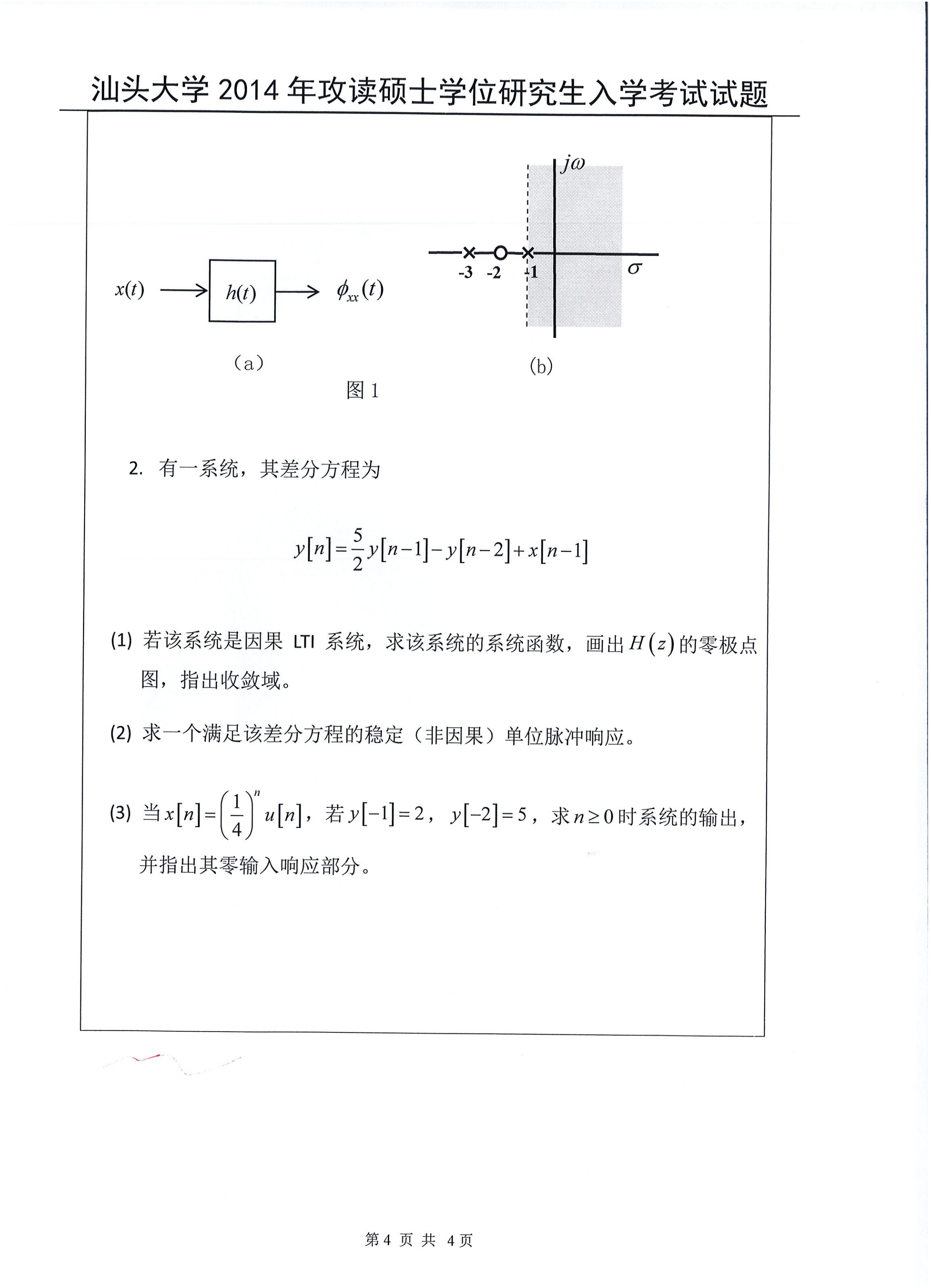 汕头大学考研辅导班:2014年汕头大学考研829信号与系统真题