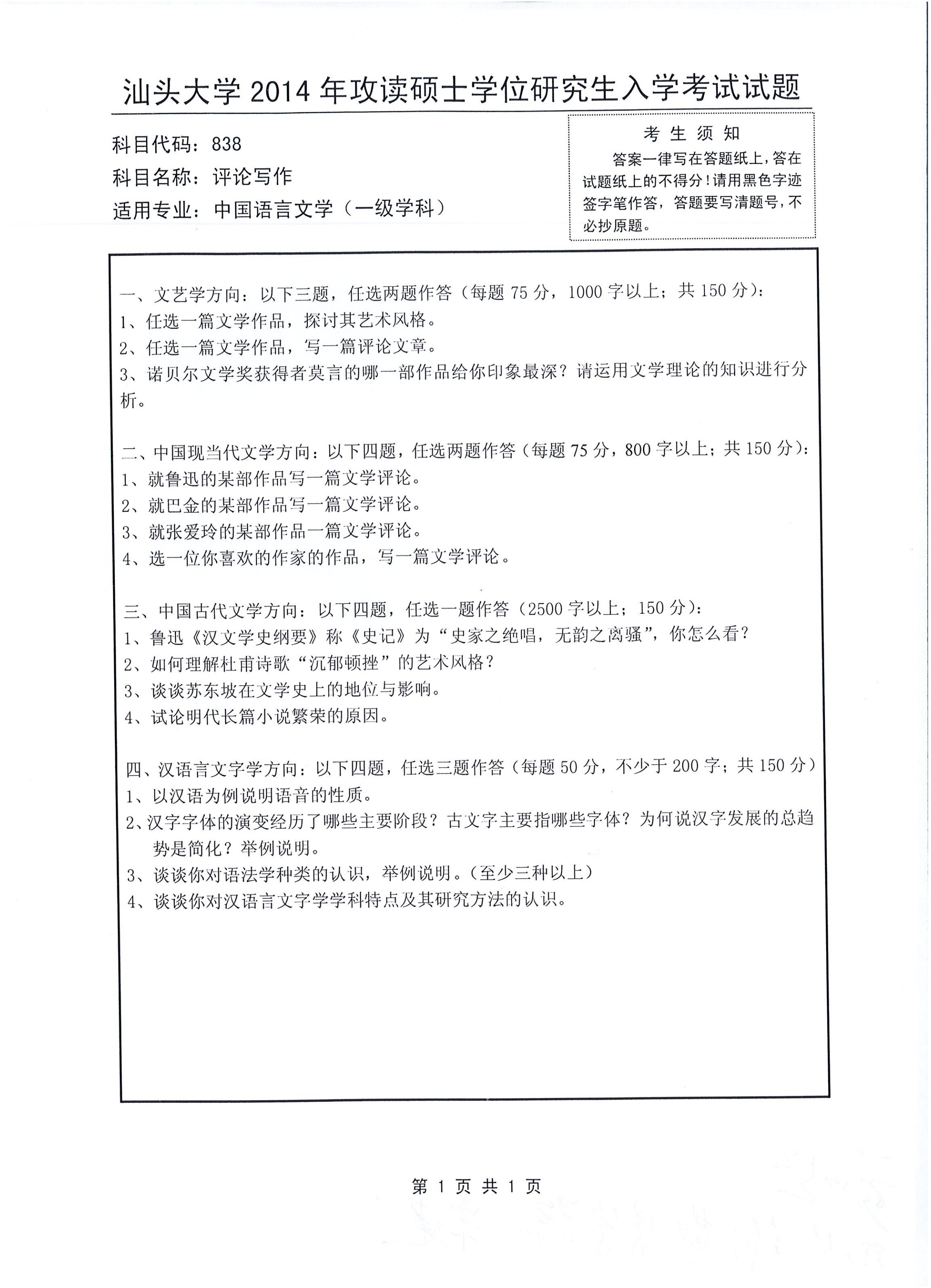汕头大学考研辅导班:2014年汕头大学考研838评论写作真题
