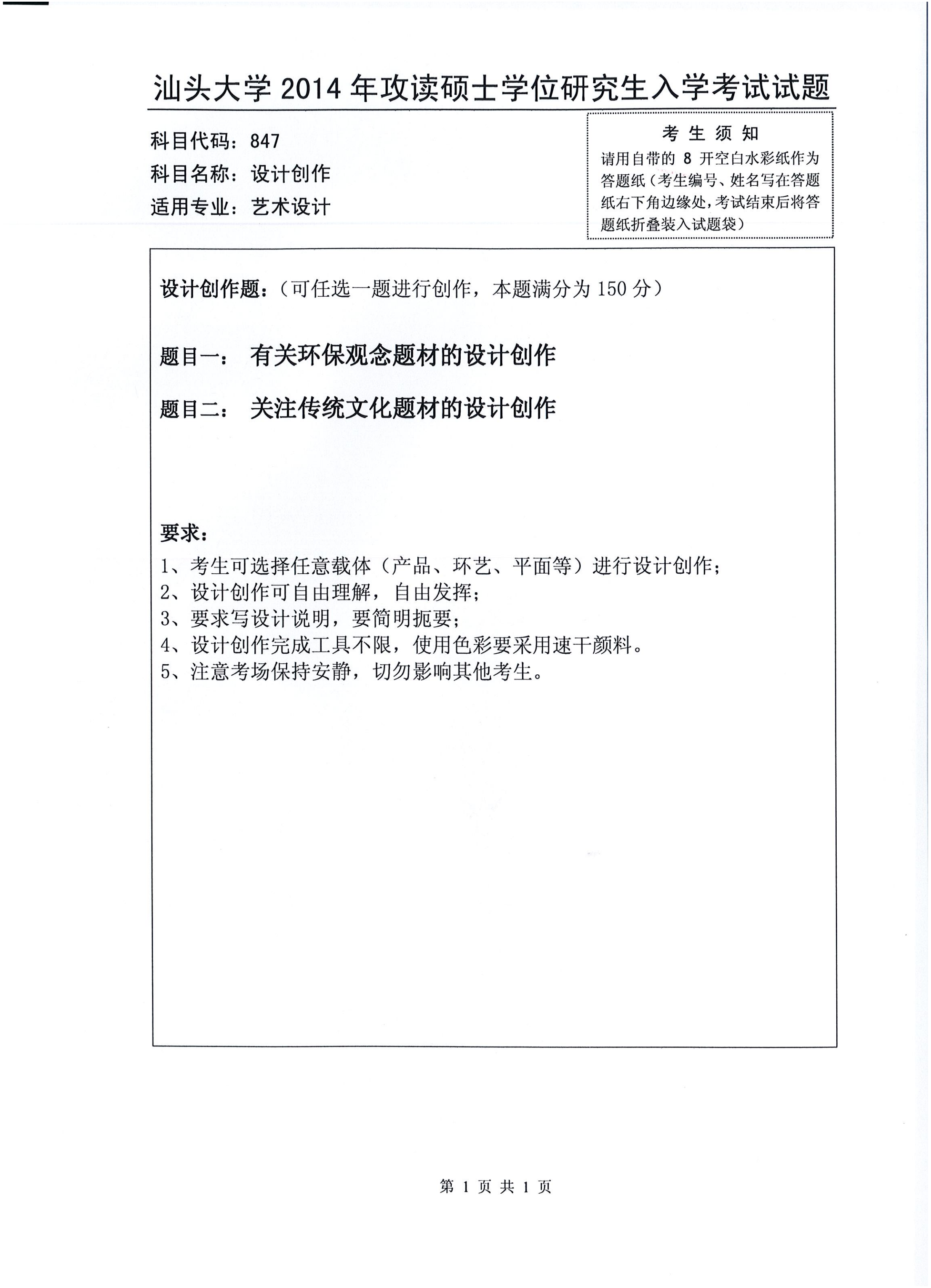 汕头大学考研辅导班:2014年汕头大学考研847设计创作真题