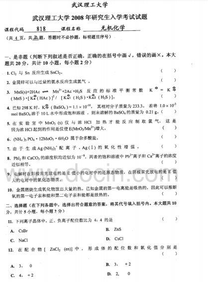 2020-2021年武汉理工考研辅导:武汉理工大学623无机化学2008年考研真题