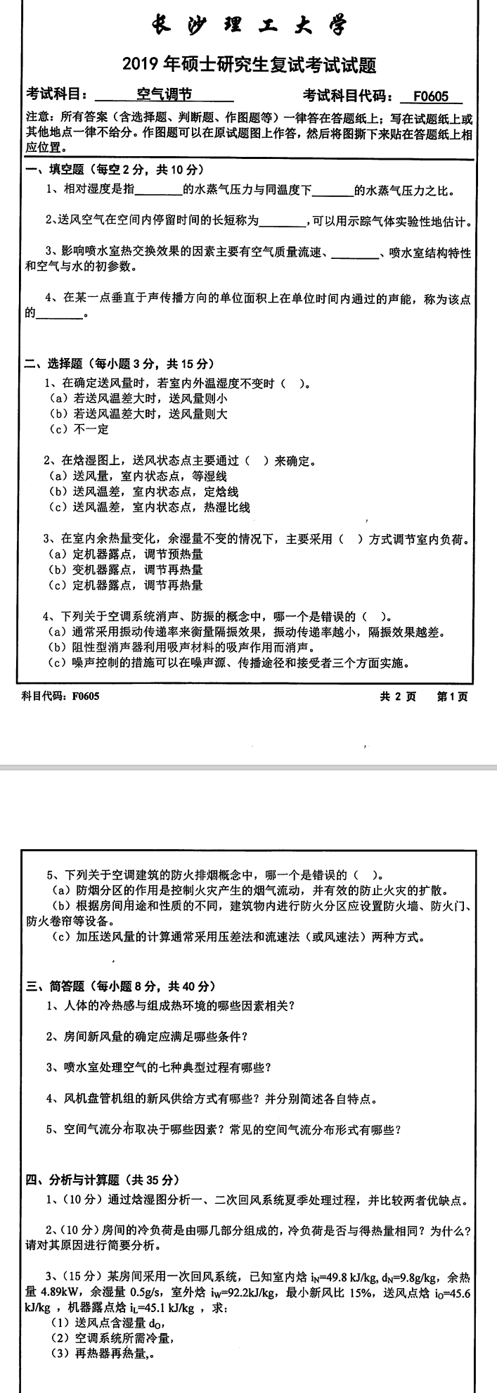 长沙理工大学考研辅导班:2019年长沙理工大学能源与动力工程学院考研复试F0605空气调节考试真题