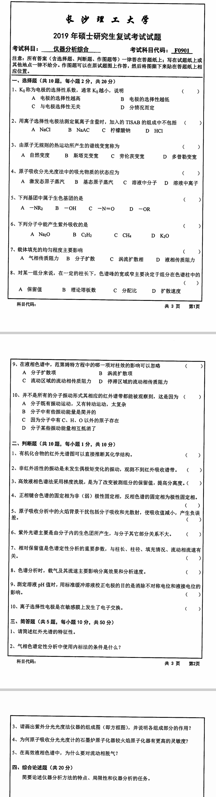 长沙理工大学考研辅导班:2019年长沙理工大学化学与生物工程学院考研复试F0901仪器分析综合科目考试真题