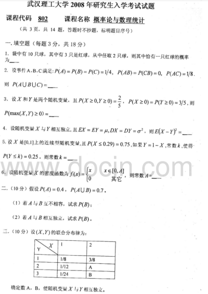 2020-2021年武汉理工考研辅导班:武汉理工大学802概率论与数理统计2008年考研真题