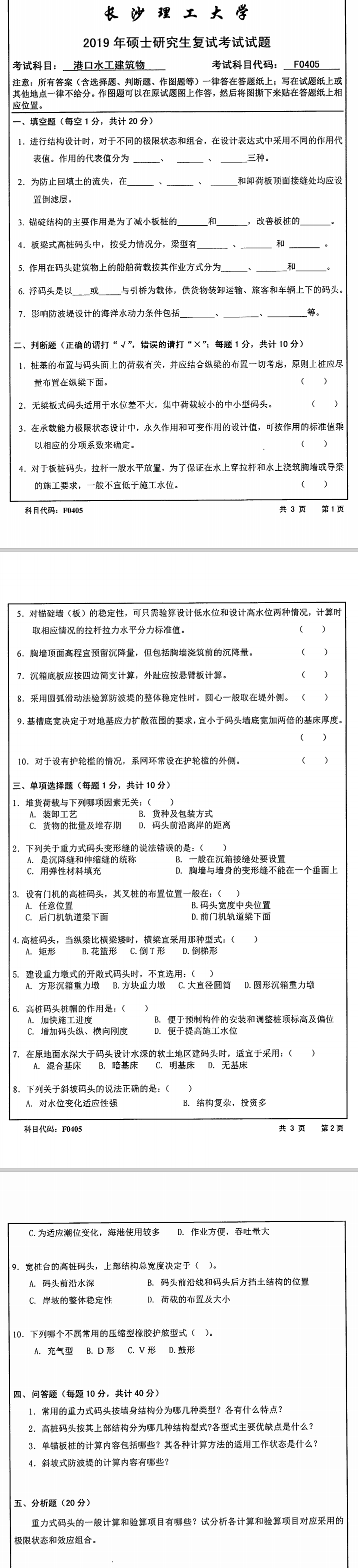 长沙理工大学考研辅导班:2019年长沙理工大学水利工程学院学院考研复试F0405港口水工建筑物科目考试真题