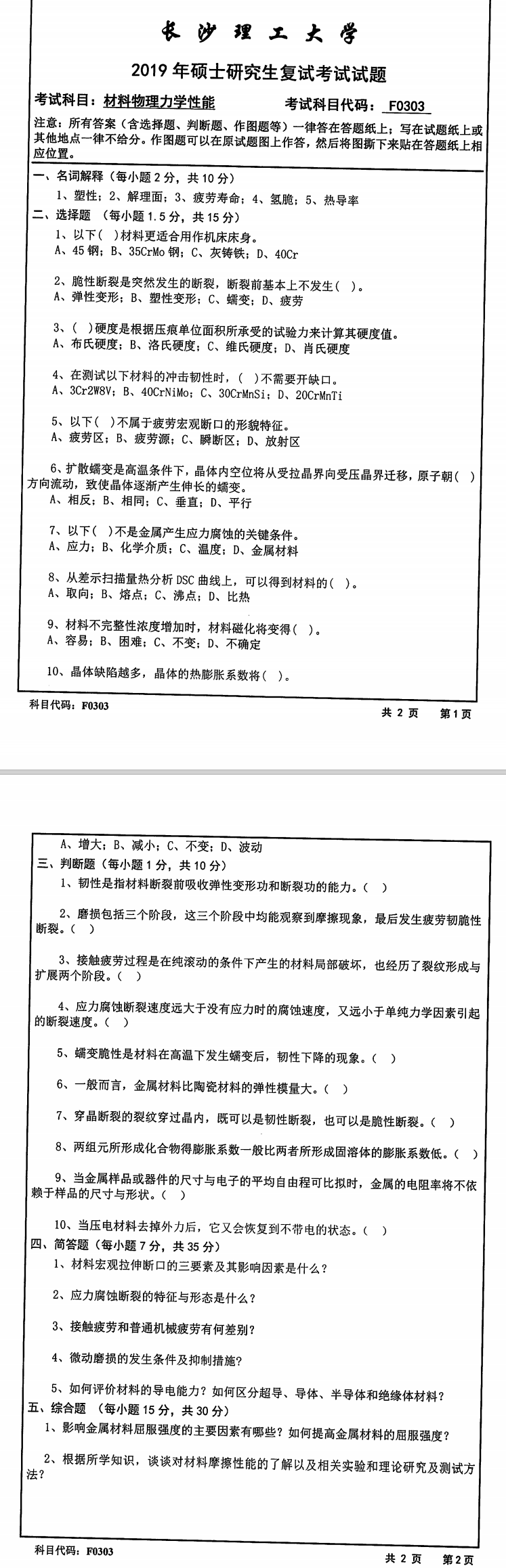 长沙理工大学考研辅导班:2019年长沙理工大学汽车与机械工程学院学院考研复试F0303材料物理力学性能科目考试真题