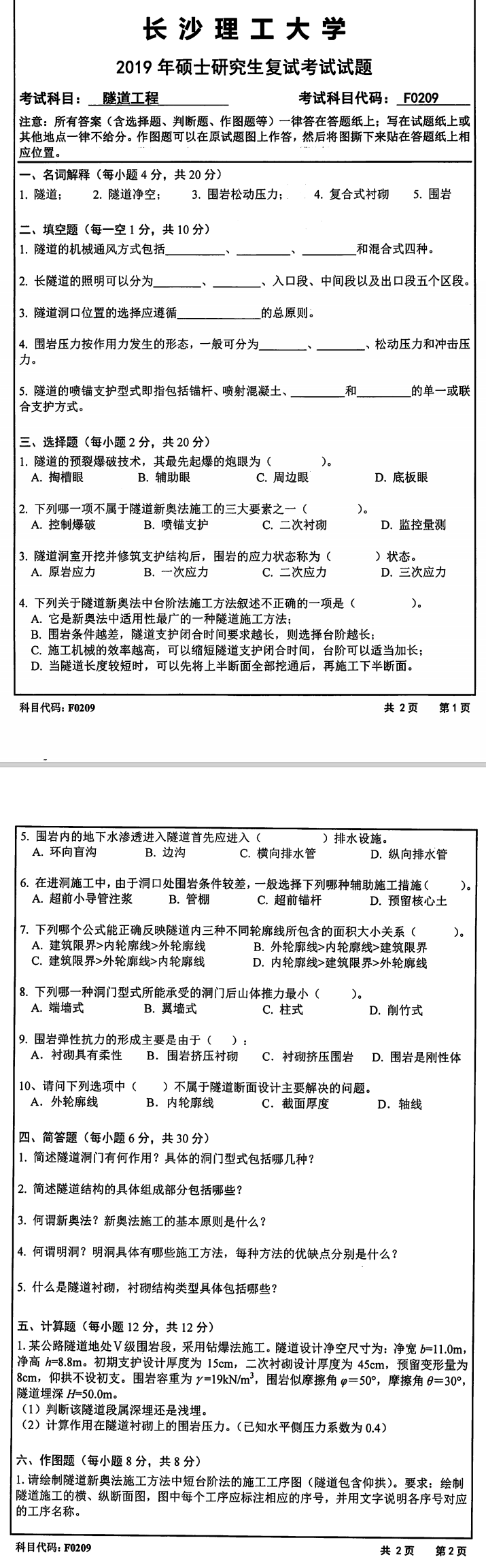 长沙理工大学考研辅导班:2019年长沙理工大学土木与建筑学院学院考研复试F0209隧道工程考试真题