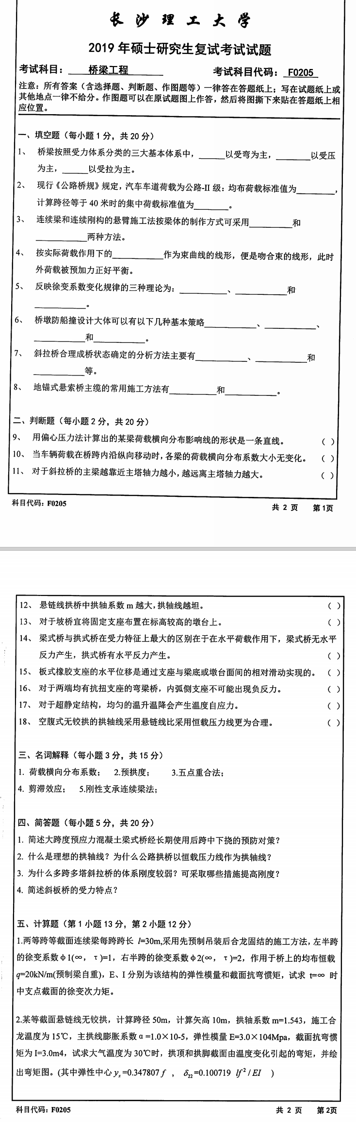 长沙理工大学考研辅导班:2019年长沙理工大学土木与建筑学院学院考研复试F0205桥梁工程科目考试真题