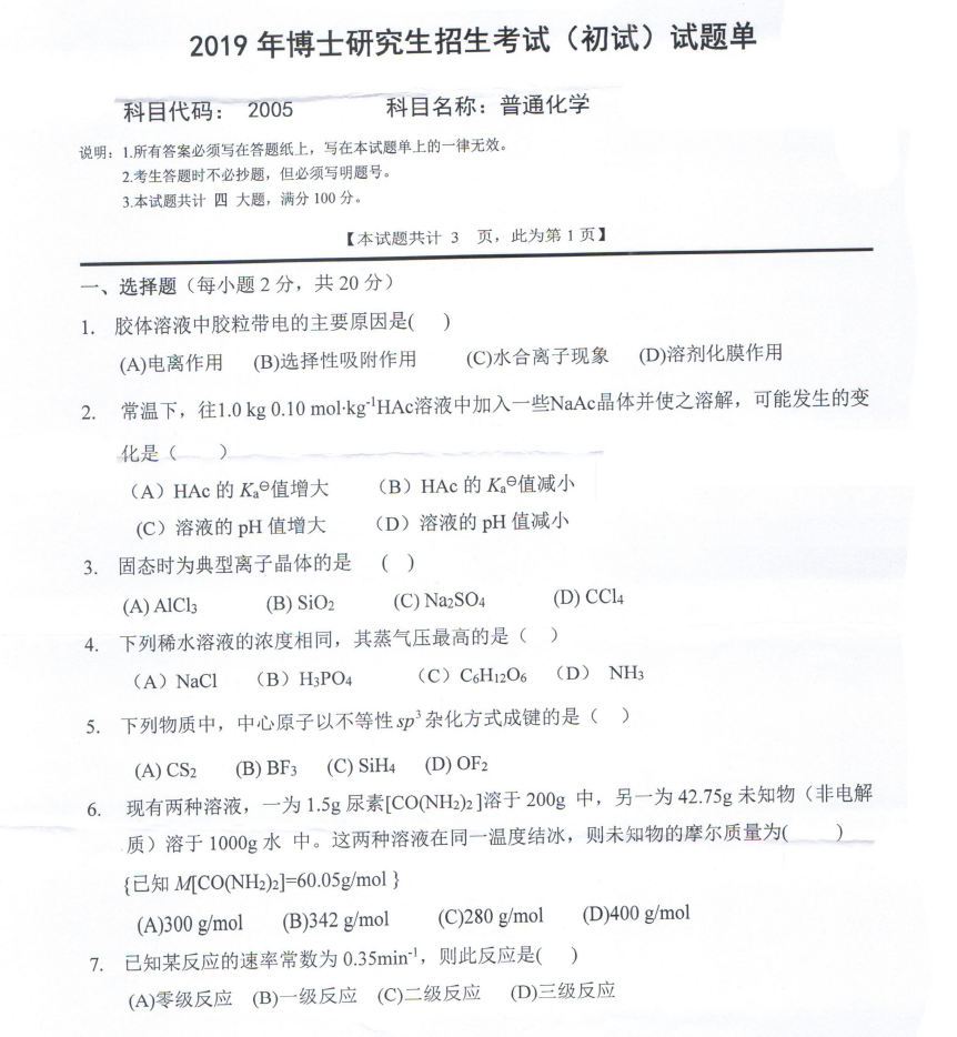 西南科技大学考博辅导班:2019年西南科技大学2005普通化学考博真题分享