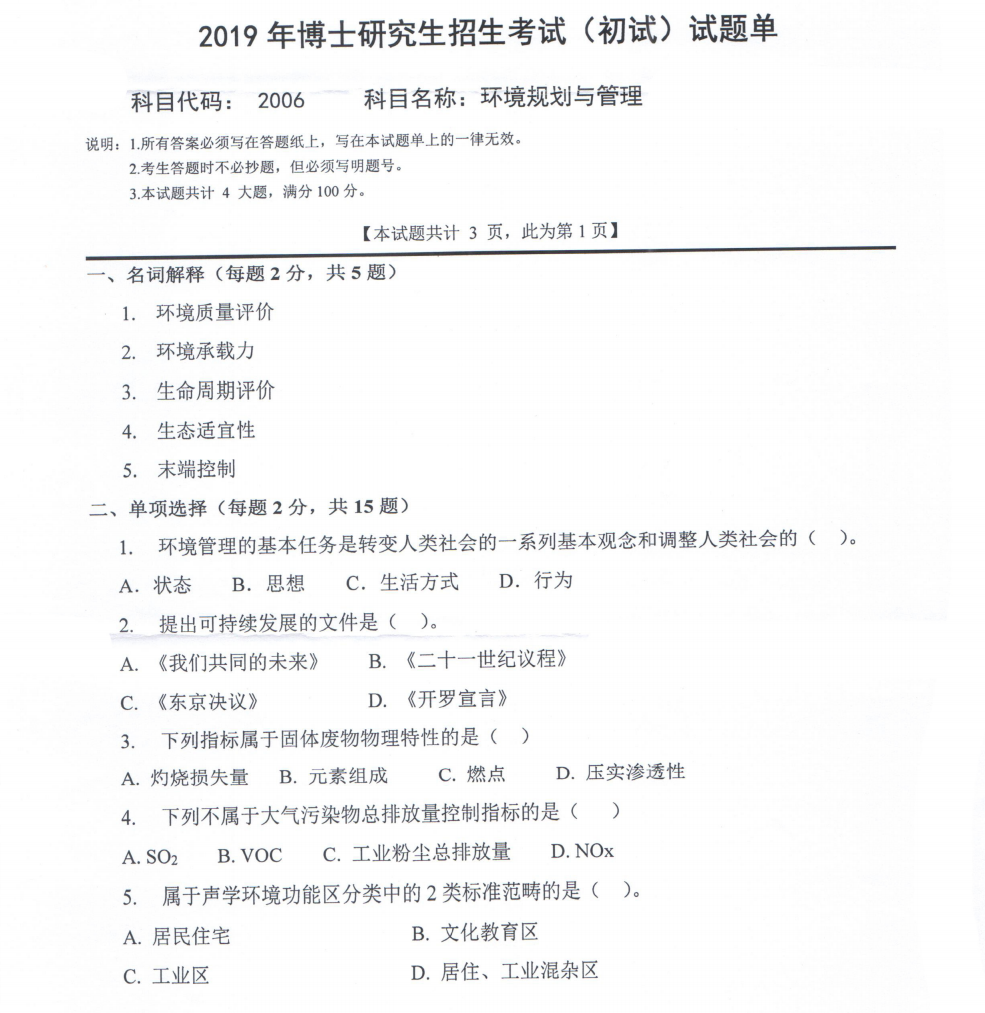 西南科技大学考博辅导班:2019年西南科技大学2006环境规划与管理考博真题分享