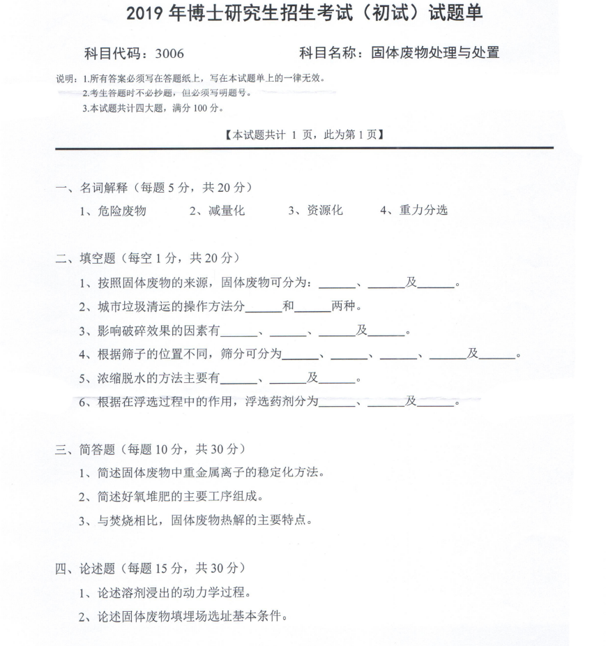 西南科技大学考博辅导班:2019年西南科技大学3006固体废物处理与处置考博真题分享