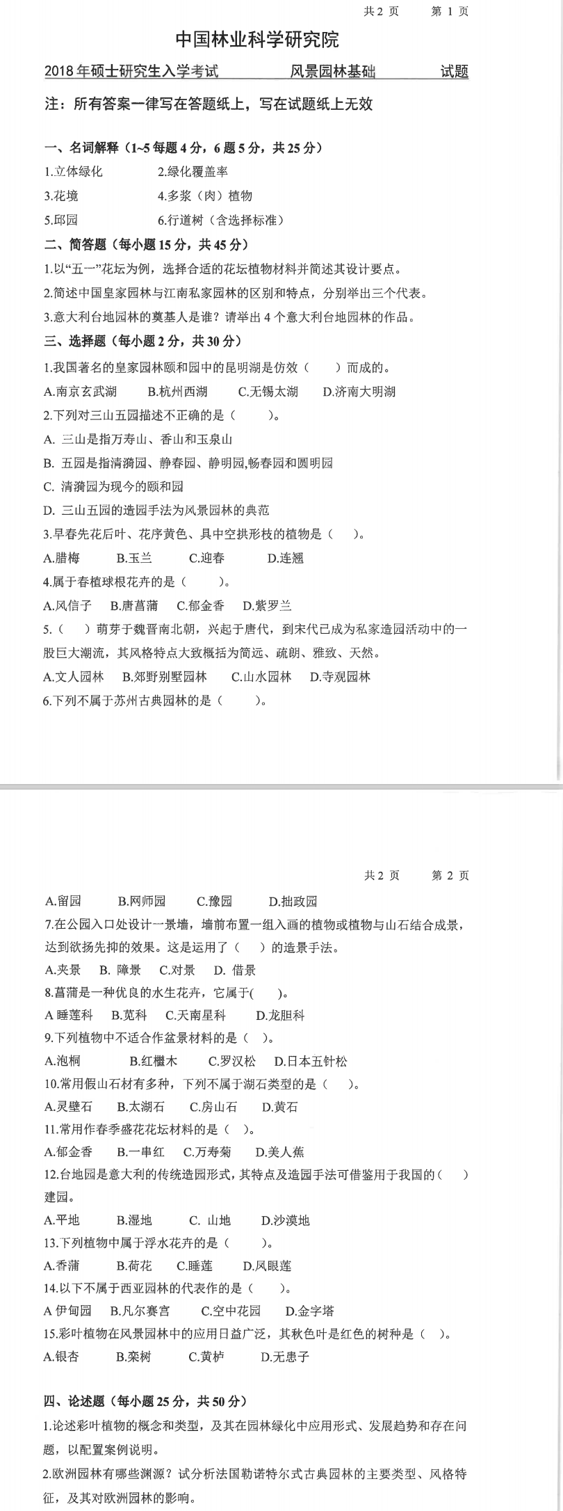 林科院考研辅导班:2018年中国林业科学研究院考研344风景园林基础招生考试真题
