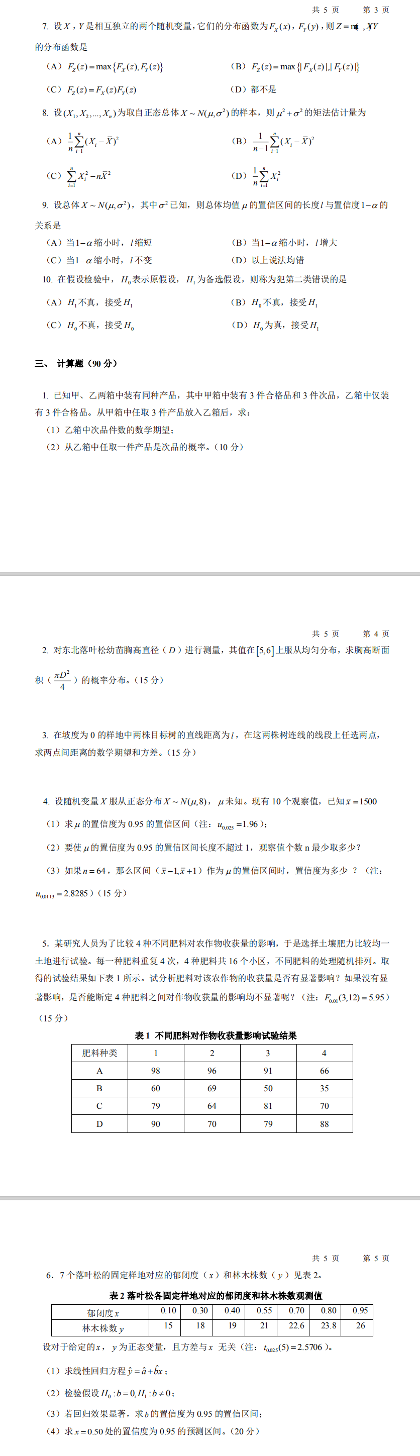 林科院考研辅导班:2017年中国林业科学研究院考研专业课701数理统计(含概率论)招生考试真题