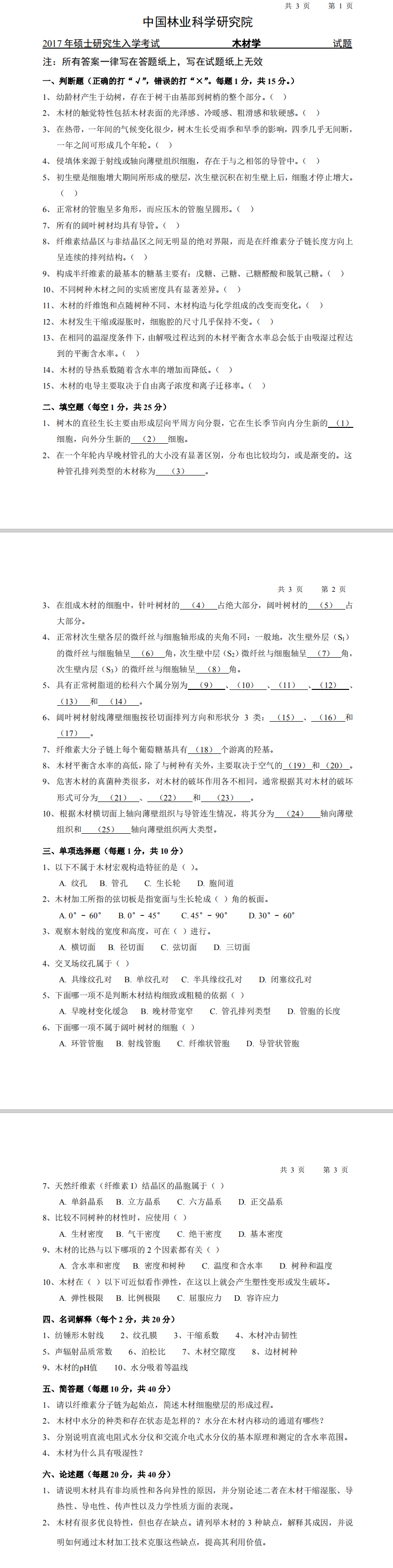 林科院考研辅导班:2017年中国林业科学研究院考研专业课808木材学考试真题