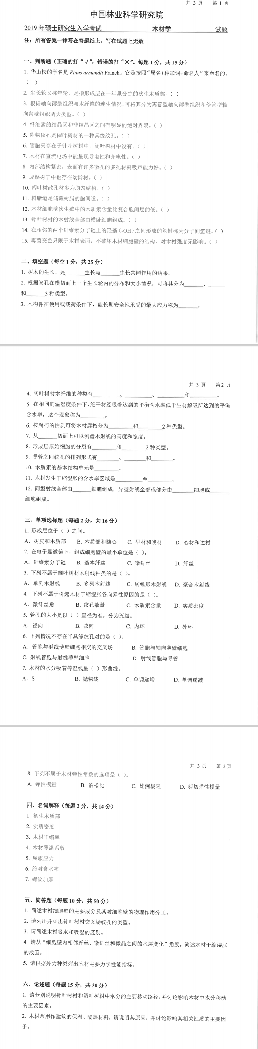 林科院考研辅导班:2019年中国林业科学研究院考研专业课808木材学考试真题