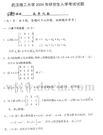 2020-2021年武汉理工考研辅导班:武汉理工大学817高等代数2004年考研真题