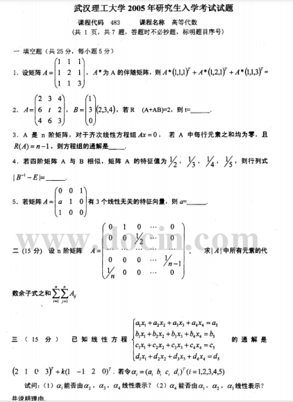 2020-2021年武汉理工考研辅导班:武汉理工大学817高等代数2005年考研真题