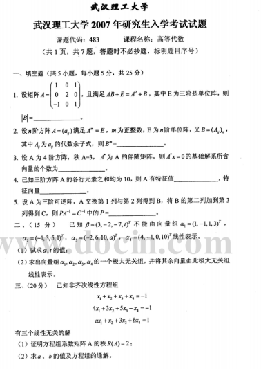 2020-2021年武汉理工考研辅导班:武汉理工大学817高等代数2007年考研真题