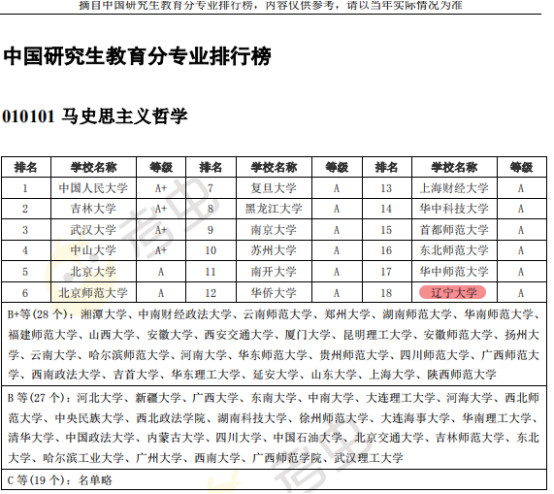 从这个排名里我们可以看到辽大的马哲专业是排得上名的,并且是A级专业