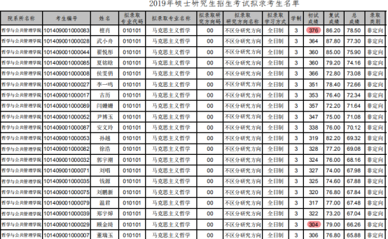 从2019年的录取名单里我们可以看到,一共录取20人,初试最高分为376分,而最低分只有304分。2019年哲学国家线是295分,也就是说只要过国家线一点,就很可能能进复试。2020年最新国家线为300分,虽然涨了5分,但是现在的趋势是扩招,所以大家不用太担心。