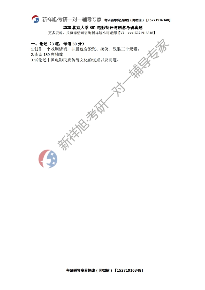 新祥旭一对一辅导:2020北京大学861电影批评与创意考研真题