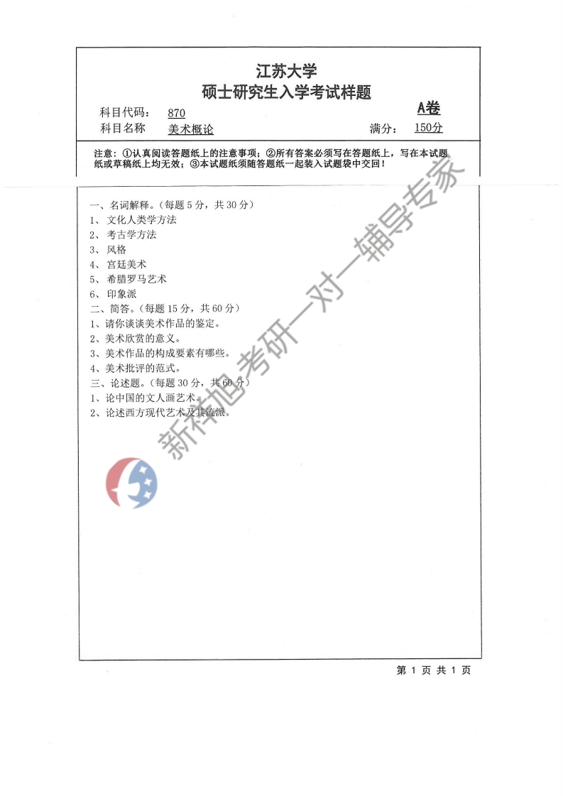 江苏大学考研辅导:江苏大学2019年870美术概论初试考研真题