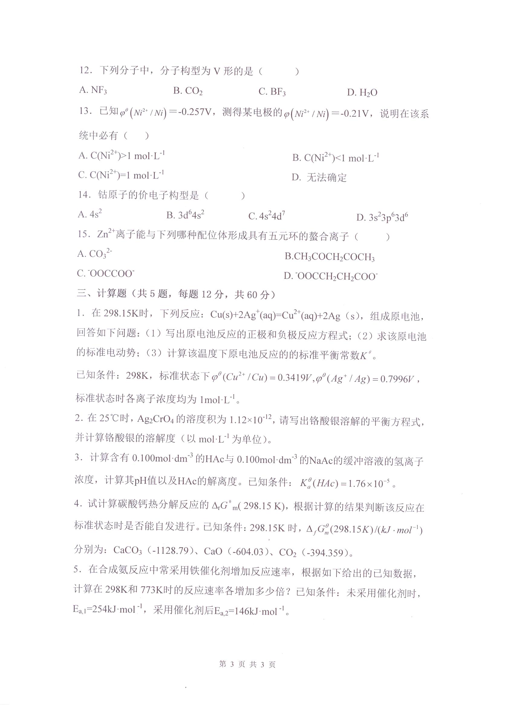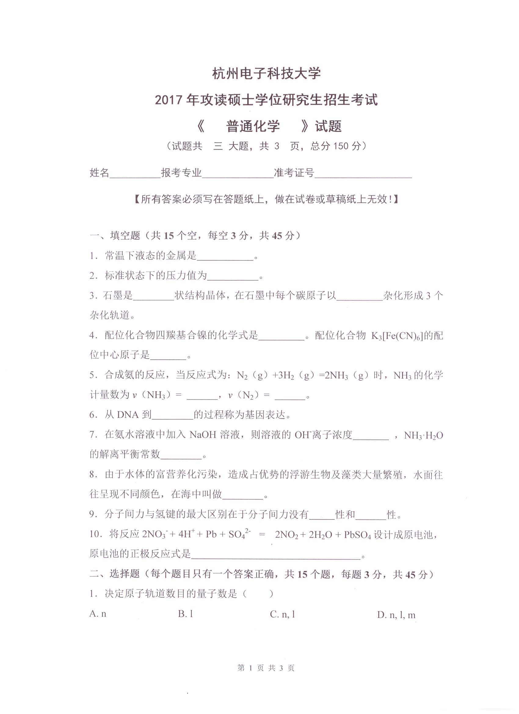 杭州电子大学考研辅导班:杭州电子科技大学2017年研究生招生考试普通化学科目考试题目