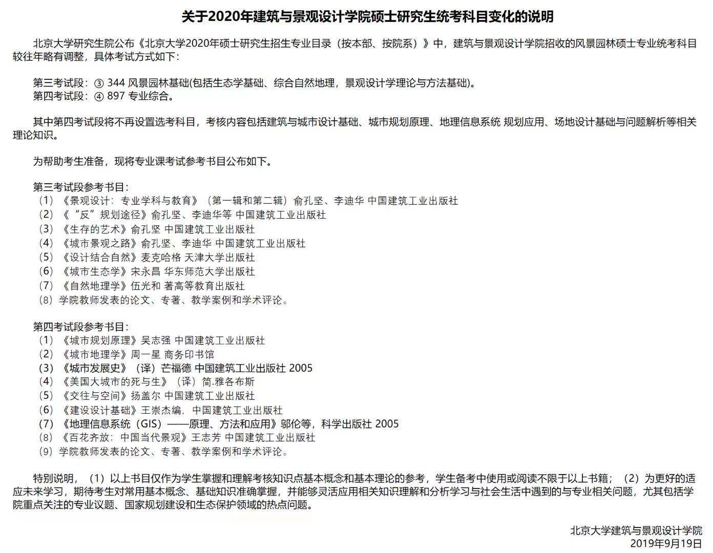 (1)专业课两门准备:2020年北京大学风景园林考研专业课发生了重大变革,专业一内容几乎不变。但是专业二从“建筑设计”和“城规”方向二选一,直接变成了以城市规划为主的专业大综合。而其实很多同学也许是因为坊间传闻“考建筑分数普遍偏高一些”,一直准备的都是建筑方向的学习。所以在2019年10月招生简章公布的时候,大家都普遍懵逼。这里给大家看一下院网公开的参考书籍。
