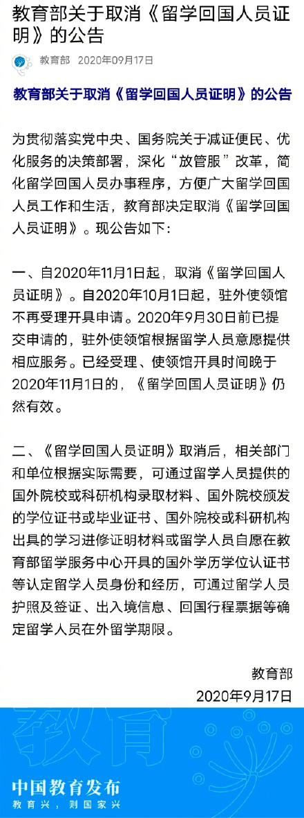 9月17日教育部发布公告称将取消《留学回国人员证明》,以简化留学回国人员办事程序,方便广大留学回国人员工作和生活。时间为2020年11月1日起,而10月1日之后,驻外使领馆不再受理开具申请,最晚的申请时间为9月30日。