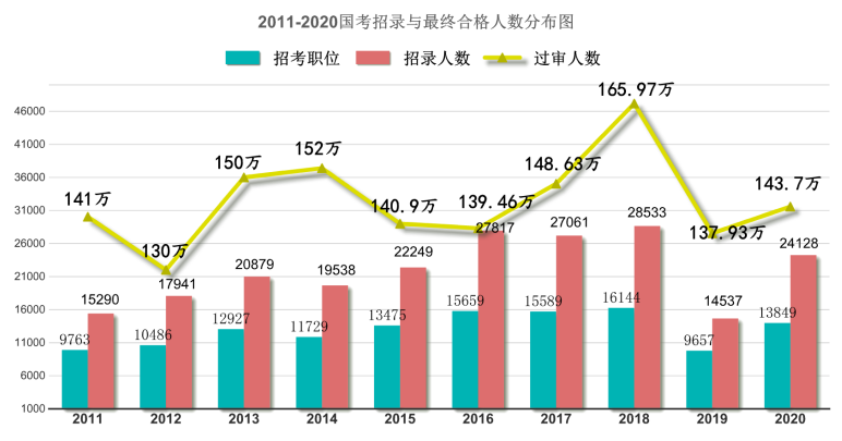 这是近十年来,报考国家公务员的数据表,从2010年以来,国考报名人数基本都是140万左右,最高的一年在2018年,达到了165.97万人,弃考率稳定在30%左右,2020国考平均竞争比为40:1。由此可以看出,人们对国考真是“又爱又恨”啊~