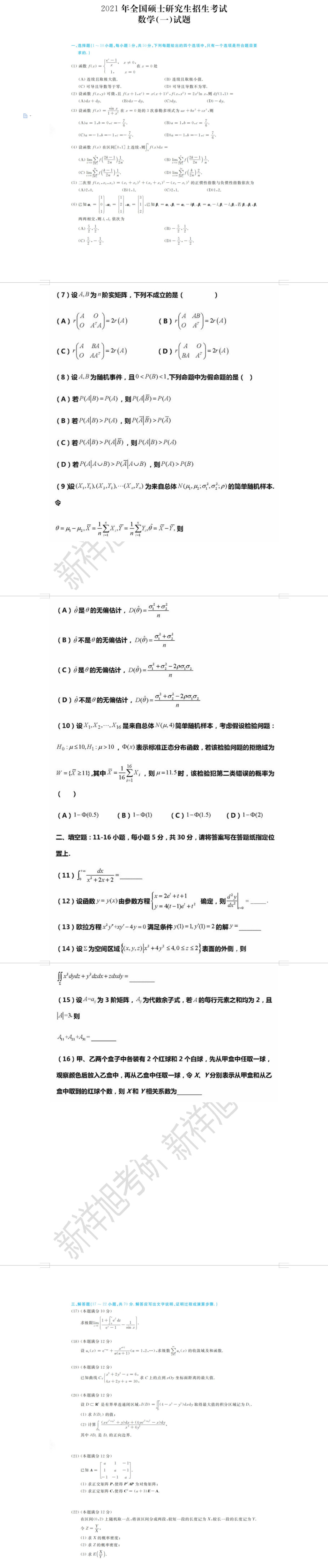 新祥旭考研:2021年全国硕士研究生招生考试数学(一)真题