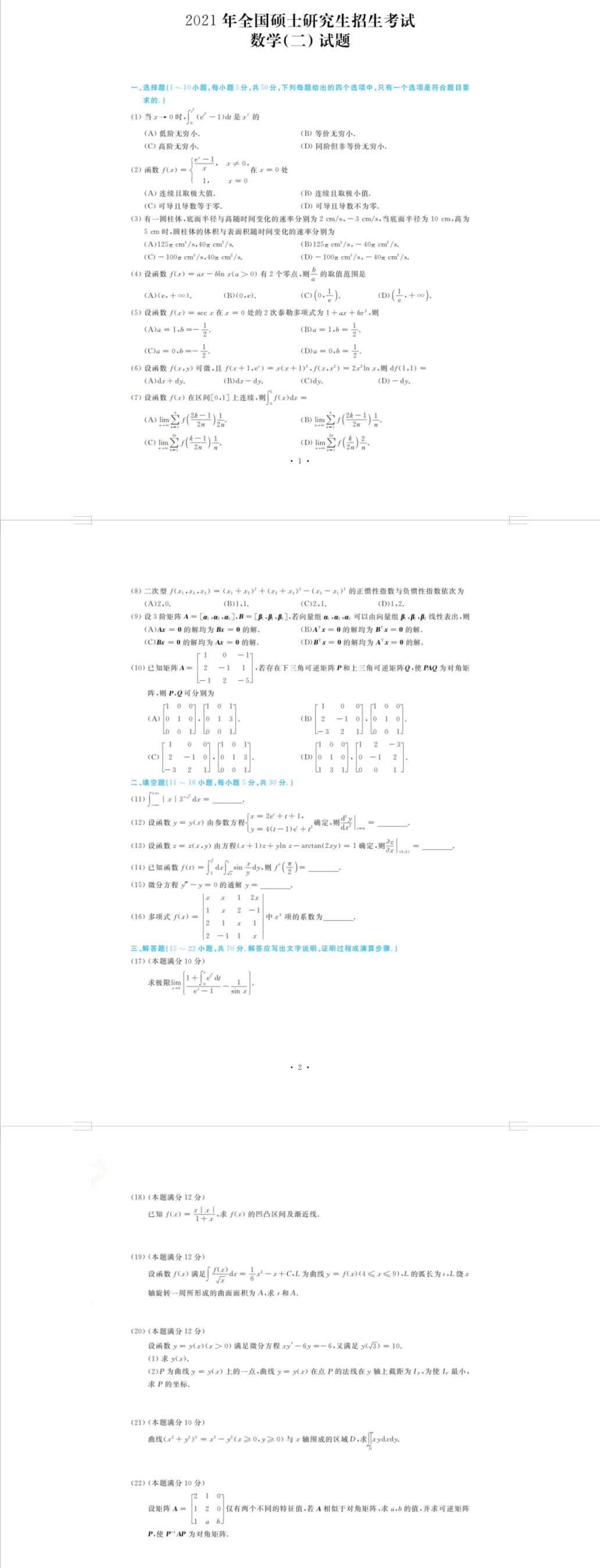 新祥旭考研:2021年全国硕士研究生招生考试数学(二)真题