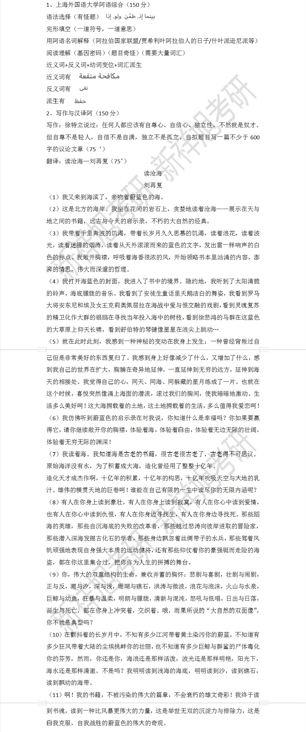 新祥旭考研:2021年上海外国语大学阿语综合真题回忆