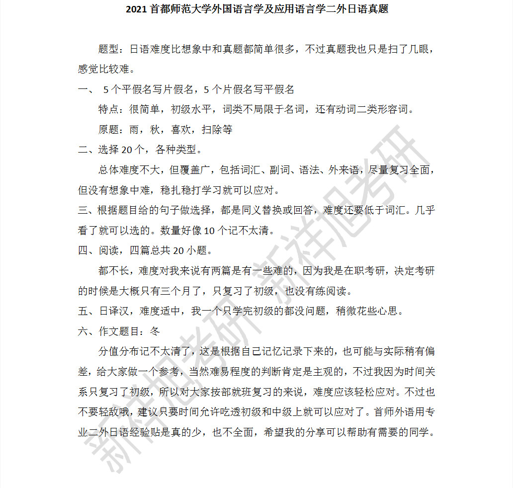 新祥旭考研:2021首都师范大学外国语言学及应用语言学二外日语真题
