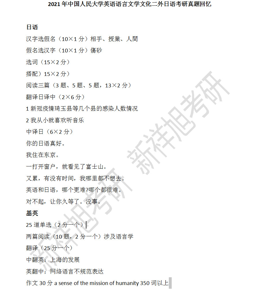新祥旭考研:2021年中国人民大学英语语言文学二外日语考研真题回忆