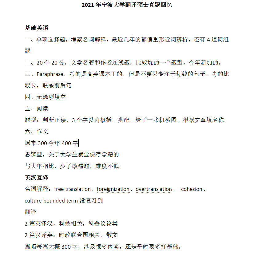 新祥旭考研:2021年宁波大学翻译硕士真题回忆