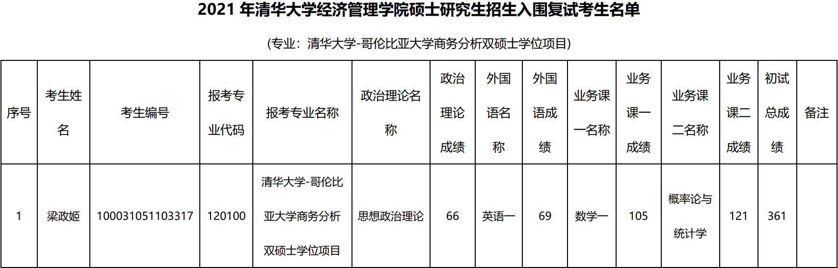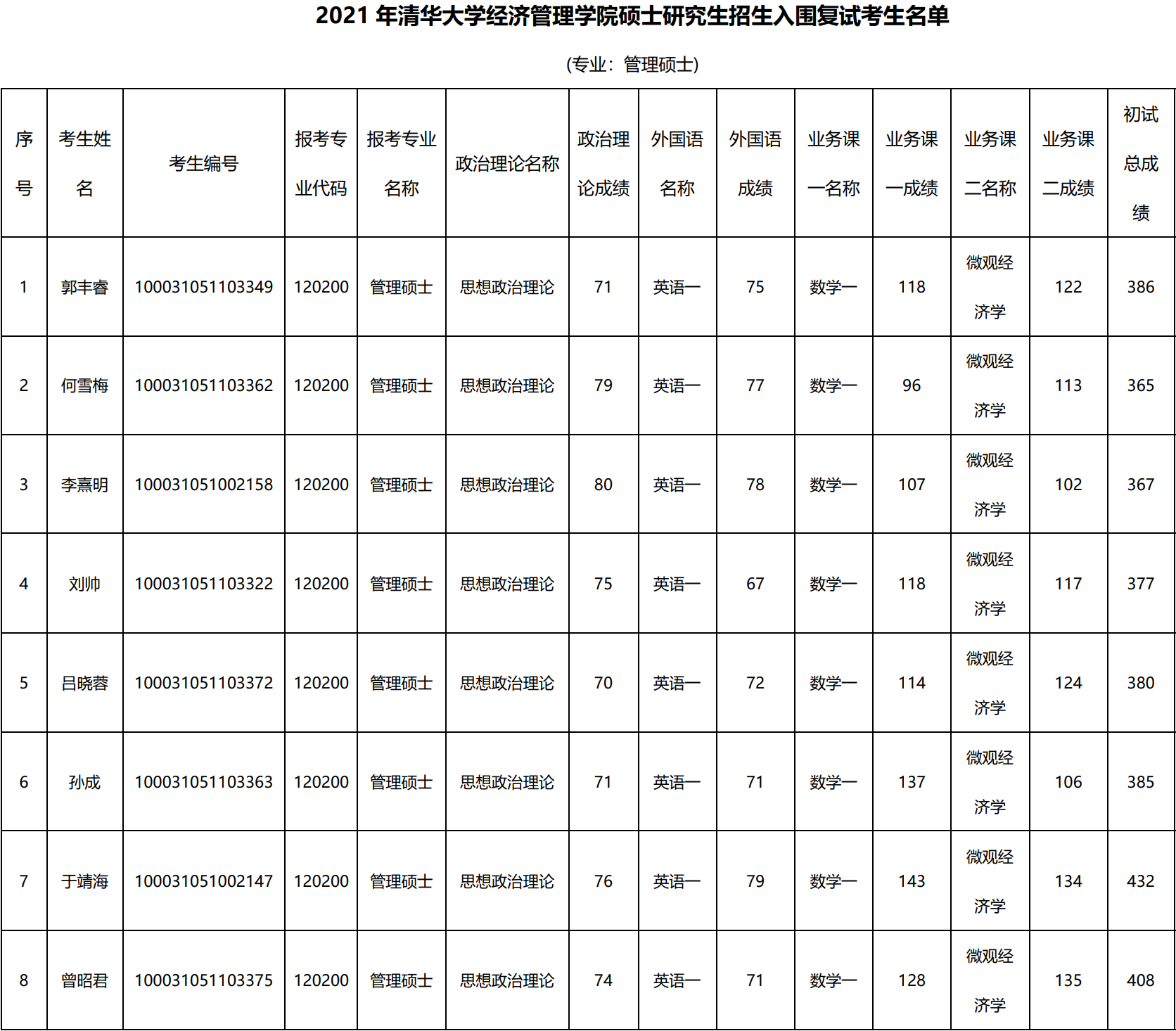 清华大学经济管理学院2021年硕士研究生入围复试名单
