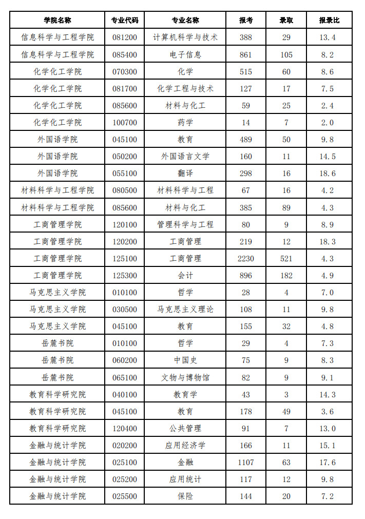 湖南大学考研报录比:2019年湖南大学硕士研究生各专业报录比