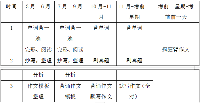前期慢一点不要紧,一定要稳住3月-6月一定要把单词、真题过一遍,英语各类型作文模板整理好,7月-8月英语单词再过一遍,真题按之前讲过的方法再抄一遍,这一边你会发现速度变快了,并且可以再查漏补缺重点记忆再次筛选出来的单词。此时就可以进行英语范文的第一遍背诵了,可以不默写但一定要背下来并且开始练习新题型。9月-10月由于要加大力度学习专业课,所以英语学习的时间要相对减少了,我采取的方法是刷题,拿出历年真题每天刷几套,一是练题感二是练速度,第三是查漏补缺找没记住的单词、分析做错题的原因,此时英语作文也要开始默写了。11月-考试前一星期,要再刷一遍真题,你会发现不仅速度更快了,而且正确率很高。对于英语作文默写要做到全对。考前一星期-考前前一天没有什么方法请疯狂背作文默写,偶尔也可以做题两套真题练手。