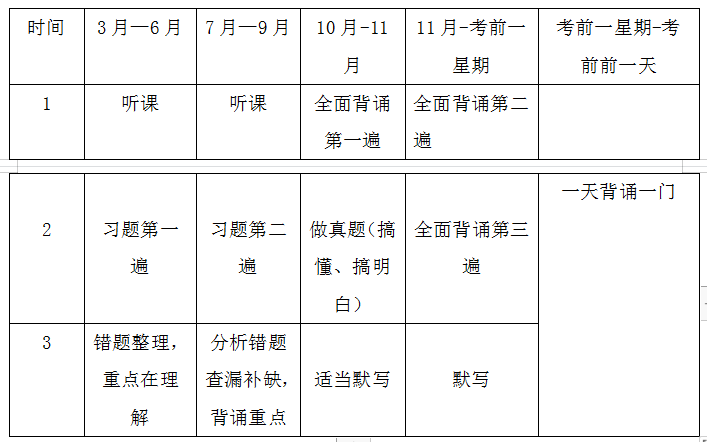 基础阶段:3月-6月 是整个考研阶段打基础的阶段,这个阶段的重点是刑法、民法,同时也要看法理学。大家会发现一般考研成绩都是综合课成绩高于基础课,这是因为综合课更多是记忆,而基础课需要理解、记忆,所以需要在这个阶段把刑法、民法的基础打牢固,该理解的一定要理解透彻,不懂的点反复听。3月-6月民法我听的是杨烁老师的课,刑法听的是于越老师的课,每天听完课我会看对应的考试分析的部分,并做对应的练习题。法理宪法我听的是马峰老师的课,法制史听的是马志冰老师的课,听完课同上看考试分析做同步练习题,检验下学习成果,提高学习效率。7月-9月此时新一年的考试分析已经出了,买一套按3月到6月学习民法、刑法、宪法、法理、法制史的方法再过一遍(强化课),听课过程中画出重点方便之后的复习,课要听最新的,做题重点把握之前做错的,把每个不懂得题弄透彻,不懂就问就思考,这个时候需要记忆一些细小、杂碎的知识点,多次重复记忆选择题的知识点,并背一背重点。10月-11月就可以全面着手背诵了,第一遍背诵时间比较长我大概用了30-40天,第一遍不要追求速度,主要还是记准记牢,也不要太慢了会影响之后的复习进度。白天背诵,晚上可以做历年真题,思考一下出题人的出题角度。第一遍过完,可以自我检验一下效果,在纸上写几道题默写一下,分析一下写不出来的原因,然后开始第二、第三遍,你会发现背诵速度越来越快,效果越来越好。12月—考前前一星期,此时是背诵的绝佳时期,真题偶尔做做练练手感,剩下的时间都拿来背诵加默写,一定要默写,写到纸上的才是能得分的,既检验了背诵效果,又练习了写字速度。考前前一星期—考前前一天,一天复习一门,循环复习,就像过电影一样,巩固背诵的知识点。