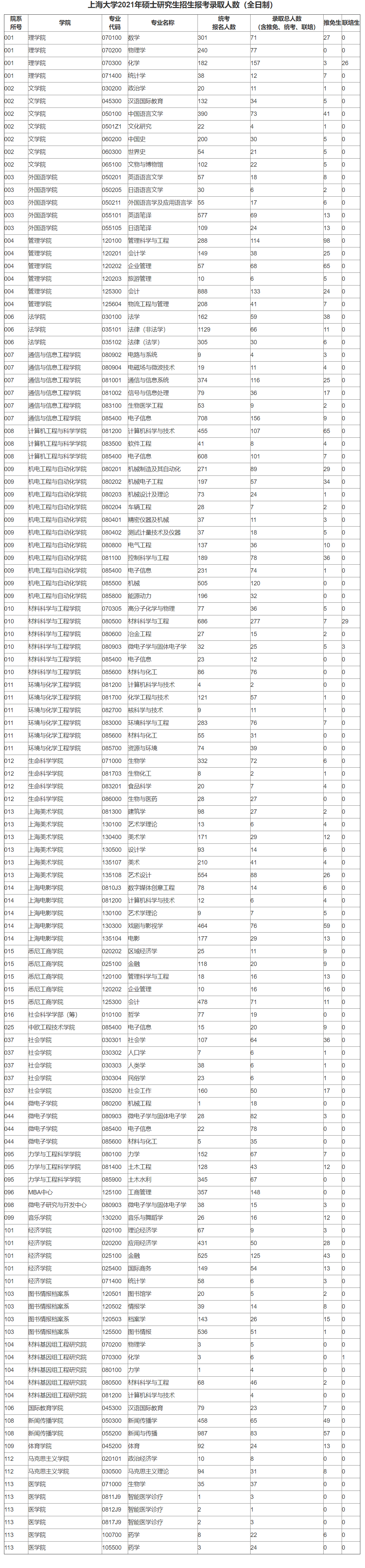 上海大学2021年硕士研究生招生报考录取人数(全日制)