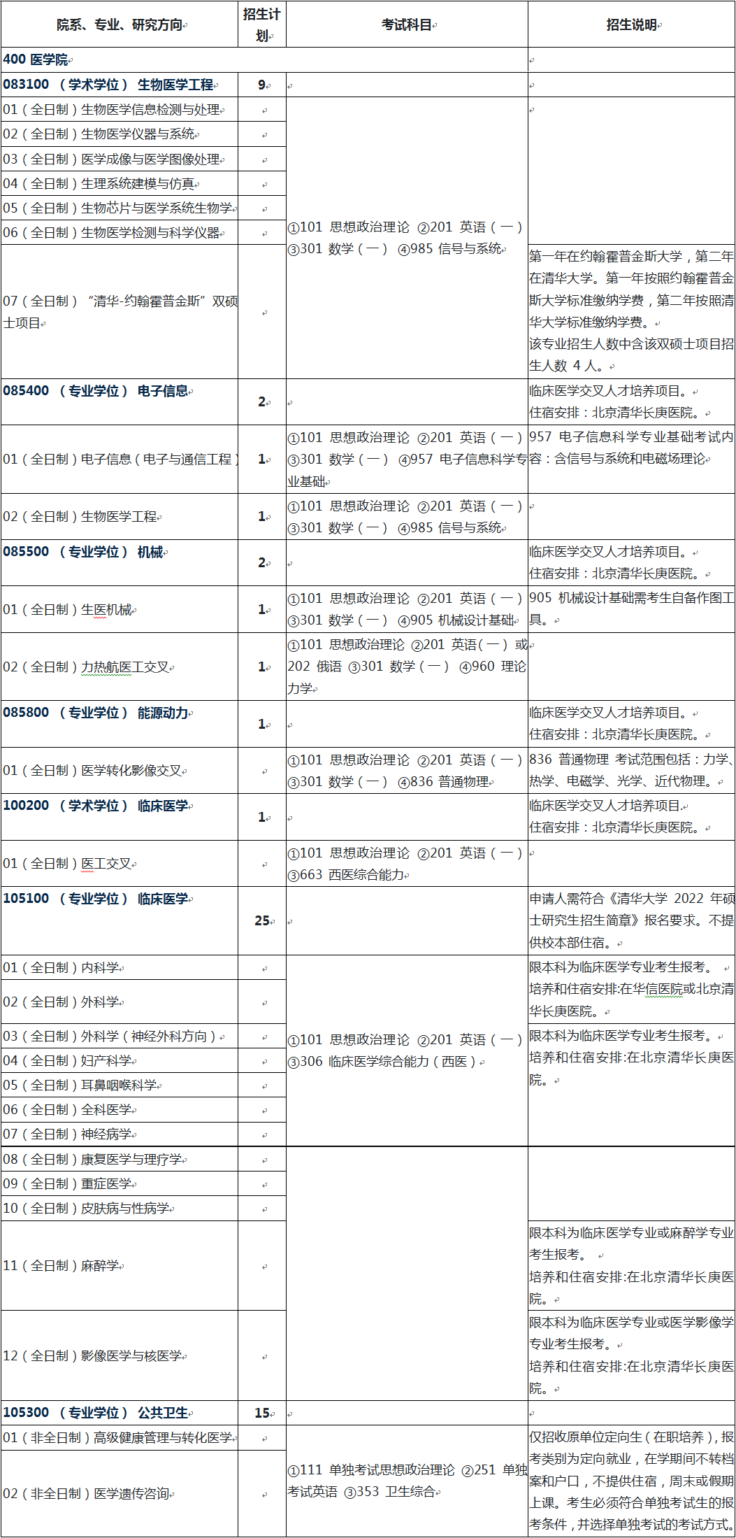 2022年清华大学医学院硕士研究生招生专业目录、考试科目、招生人数